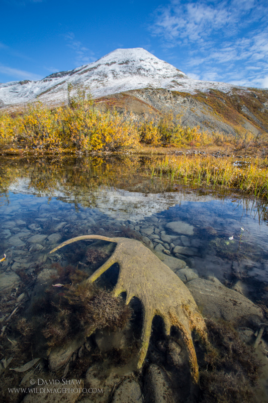 This final shot was just a day or two later of the one above. I was hiking with a couple of my clients up a tributary creek to the Kongakut. We’d gotten snow the night before, and the morning felt twice as bright. We’d been working our way over little side channels of the creek through an enormous patch of willows, still yellow with autumn leaves despite the new snow. We were stepping over a little stream of water above a pond when I noticed this moose antler fully submerged in the glass-clear water. A story was unfolding in that scene, and I knew just how to tell it. I made a few images before stepping away from the scene and was getting ready to move on, but the sense that I hadn’t completed the shot came back for me. Rather than hike on, I jumped back across the creek, and clinging to a willow, leaned out over the water where I could frame this image. With the click of this image, the sense of flow disappeared and I moved on.